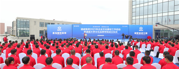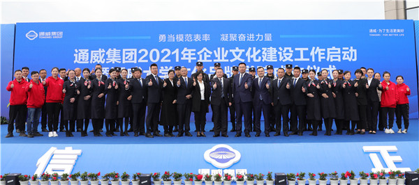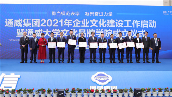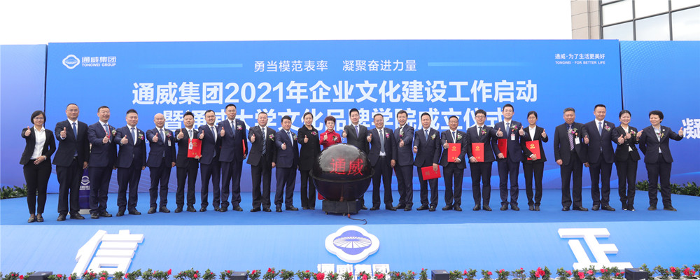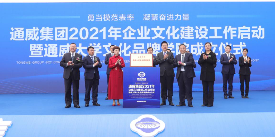 3月26日,通威集團2021年企業文化建設工作啟動暨通威大學文化品牌學院成立儀式在樂山永祥新能源隆重舉行。通威集團禚玉嬌總裁,通威股份董事長謝毅、總裁郭異忠,通威股份董事、永祥股份董事長段雍,集團副總裁、集團企業文化建設專項工作小組執行組長黃其剛,集團財務總監肖吉華,股份財務總監周斌,通威股份人力資源總監、永祥股份副總經理易繼成,通威新能源執行董事兼總經理邱艾松,永祥股份總經理兼永祥新能源總經理李斌,通威太陽能副總經理楊文棟、永祥股份董事兼首席技術官甘居富、永祥股份財務總監袁仕華、永祥股份副總經理袁中華、通威新能源有限公司總經理助理何一弘、通威股份傳播策劃部部長馮暢,通威集團工會主席、通威大學執行副校長、集團企業文化建設專項工作小組執行組長張紅纓等領導出席。來自集團、股份管理總部,永祥股份及各體系高管、員工共500余人參加儀式。