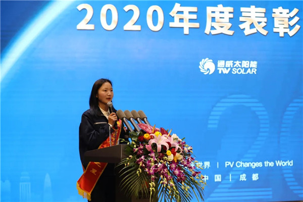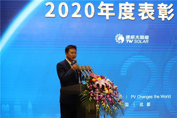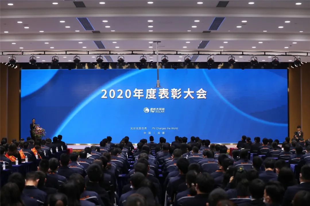 3月11日,通威太陽能2020年度表彰大會在雙流基地報告廳隆重舉行。通威太陽能合肥、雙流、眉山、金堂四地中高管、優秀員工和優秀部門代表、相關部門代表現場及視頻參會,通威股份董事長謝毅出席。