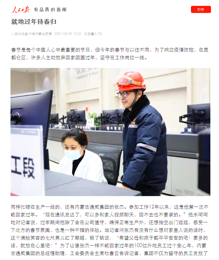 2月9日,《人民日報》《包頭日報》等媒體《就地過年待春歸》欄目聚焦內(nèi)蒙古通威高純晶硅員工堅守崗位就地過年,報道了內(nèi)蒙古通威高純晶硅關愛員工的家文化。內(nèi)蒙古通威高純晶硅總經(jīng)理助理、工會主席杜春云接受記者采訪。