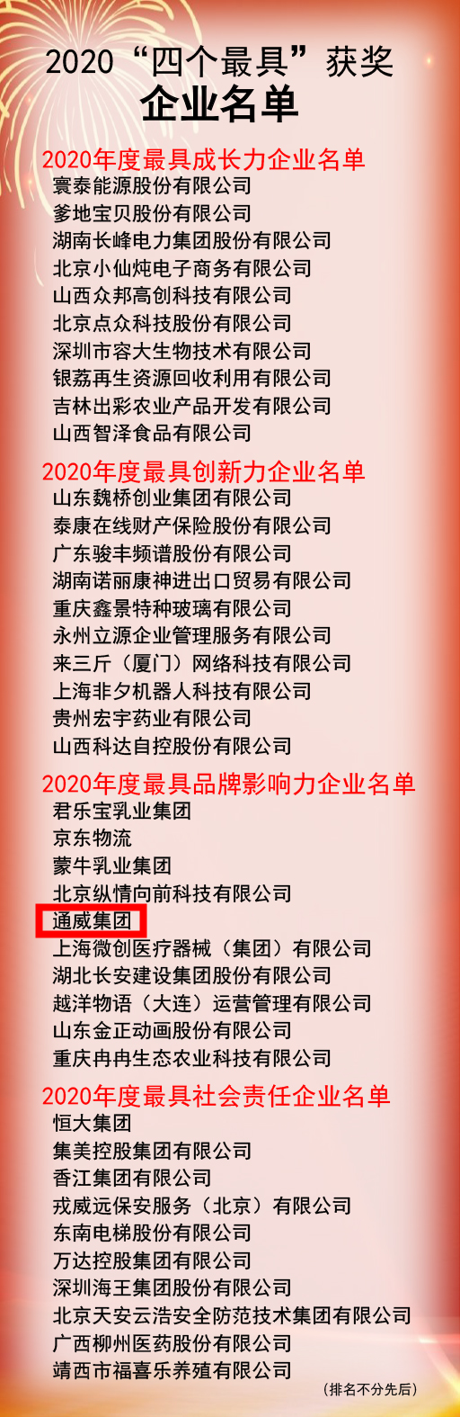 本屆評(píng)選揭曉的“四個(gè)最具”榜單由各省和地級(jí)市工商聯(lián)、中華工商時(shí)報(bào)記者站推薦,歷經(jīng)評(píng)審會(huì)初選、網(wǎng)上公示、專家評(píng)審委員會(huì)評(píng)審后,經(jīng)過(guò)層層選拔,確定最終名單。憑借多年穩(wěn)健快速發(fā)展和創(chuàng)新發(fā)展成果,通威榮獲2020年度“最具品牌影響力企業(yè)”。
