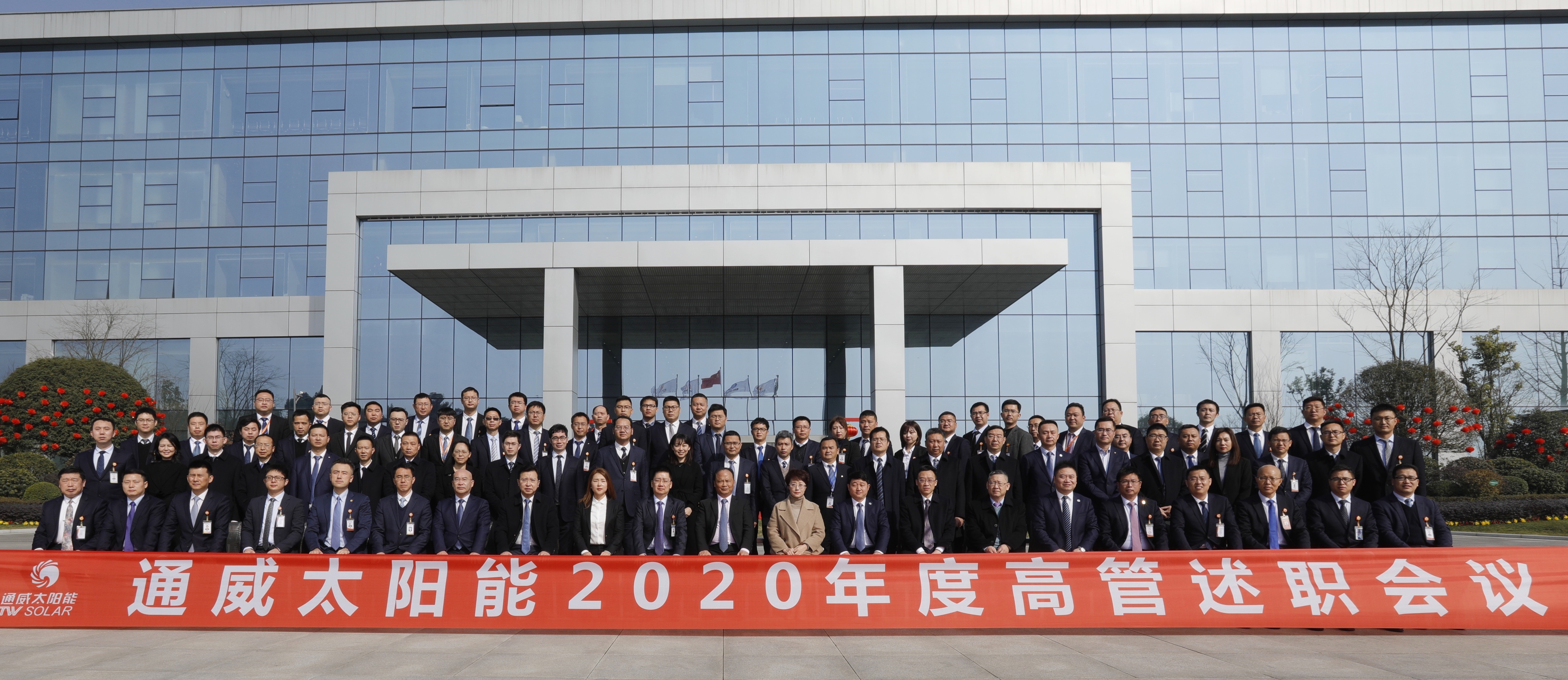 1月22日,通威太陽能2020年度高管述職會議成功舉行,通威集團董事局劉漢元主席出席并作重要指示,通威集團禚玉嬌總裁,通威股份監事會主席鄧三,通威股份董事、永祥股份董事長段雍,通威股份光伏事業部總裁陳星宇,通威新能源有限公司執行董事兼總經理邱艾松,通威股份光伏首席技術官邢國強,通威股份財務總監周斌等領導出席會議。通威股份董事長謝毅、通威太陽能全體高管作2020年度述職報告,永祥股份、通威新能源終端管理團隊列席,通威太陽能合肥、成都、眉山、金堂四地中干及員工代表現場及視頻參會。