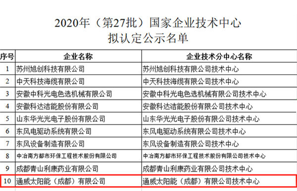 近日,國家發展改革委官網發布《關于發布2020年(第27批)新認定及全部國家企業技術中心名單的通知》,通威太陽能成都公司榮列榜單,該榮譽的獲得彰顯了公司的綜合競爭實力以及顯著的技術創新能力。