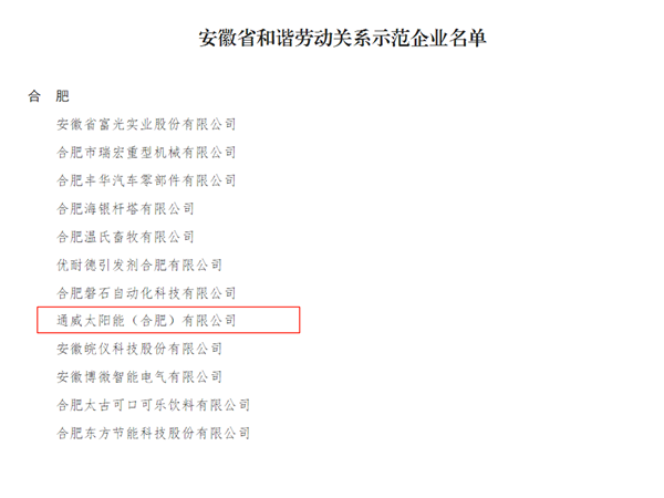 通威太陽能合肥公司榮獲2020年度“安徽省和諧勞動關系示范企業”稱號
