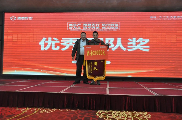 合影留念 會上,各水產養殖公司、養殖基地分別對照2020年養殖計劃與實際養殖過程中的具體執行情況存在的差異,進行了深刻的剖析和復盤匯報,尋找改進措施。各職能線分別從財務體系、采銷體系、團隊建設及機制保障等方面進行了線路支持與協同工作匯報。水產養殖業務執行組長周儉對2020年養殖業務的工作進行總結,并對2021年各水產養殖單位的發展目標及規劃提出明確要求。 會議現場 大會對2020年先進單位和優秀個人進行了表彰。當前通威水產養殖業務尚處在攻堅階段,以此激勵團隊全員牢固樹立創業精神,腳踏實地、學習標桿,不斷向新的目標努力奮進。 王總對水產養殖業務2021年經營思路進行了分析和介紹,并表示,大家首先要快速轉變從養魚到養蝦的發展思路,一定要把盈利放在經營的第一位。其次,養殖要以生產為龍頭,一切資源都要圍繞生產的提質增效做好服務保障。以對蝦養殖為業務主線是2021年發展目標,團隊要快速突破技術瓶頸,并做好人才隊伍的培養與建設。第三,要以養殖預算為抓手、強化執行計劃的落實,深刻總結問題與不足,務必全面做好2021年的發展預算及計劃。2021年是養殖業務發展的關鍵節點,全員要認真消化并落實養殖技術手冊、信息化系統使用的優化升級和未來養殖三年規劃等重要工作。 表彰2020年先進單位和優秀個人 郭總對2020年的養殖結果進行了總結,并對2021年水產養殖業作出重要工作指示。郭總表示,通威將堅定不移地踐行“漁光一體”戰略,3000億市值靠新能源,萬億市值一定靠“通威魚”,水產養殖在整個通威事業版圖當中占據著非常高的地位,大家一定要有信心去實現目標。未來國內對蝦的消費量在不斷上升,全員要認真做好發展規劃。管理的核心是要執行到位,2020年通威企業文化強調的是執行力建設,所以我們要認真落實,積極貫徹執行力。“制度必執行,承諾必兌現,說到必做到”,養殖業務全員要繼續堅持做好養殖的初心不變,敢于迎難而上,共同抓好發展機遇,并堅決踐行劉主席重要指示,把通威水產養殖事業做大做強。