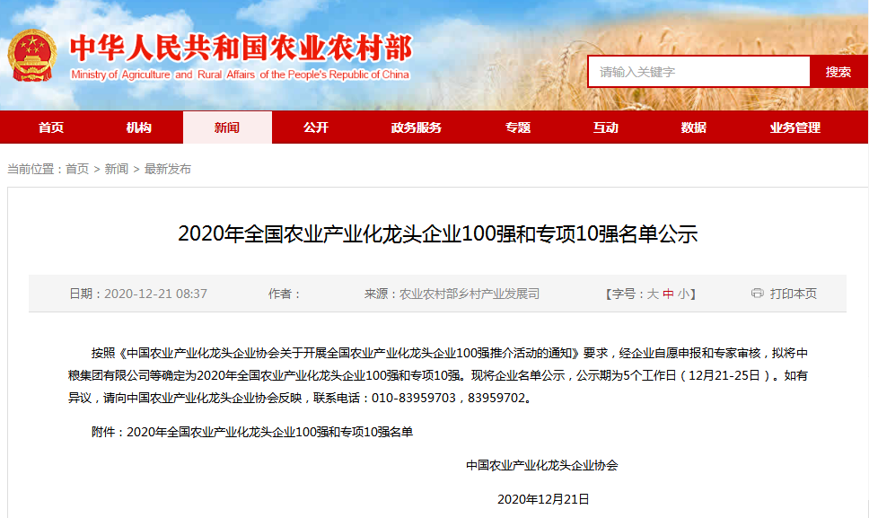 12月21日,國家農業農村部官網公布了2020年全國農業產業化龍頭企業100強和專項10強擬認定名單。通威股份榮膺“全國農業產業化龍頭企業100強”“全國農業產業化龍頭企業科技創新10強”以及“全國農業產業化龍頭企業外貿出口10強”等三項殊榮,并位列“科技創新10強”專項榜單首位。