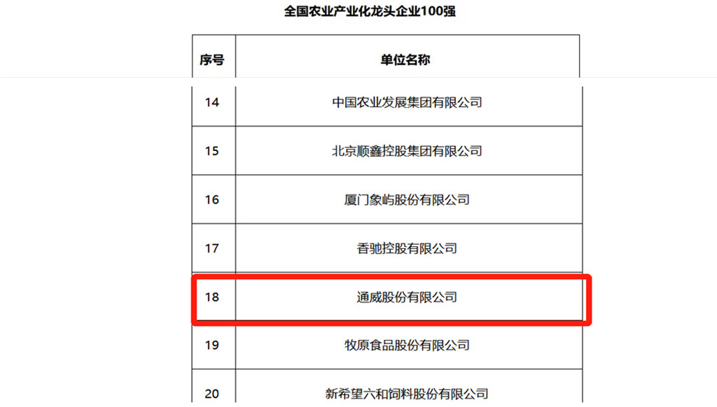 通威股份榮膺“全國農業產業化龍頭企業100強”榮譽稱號