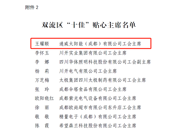 通威太陽能成都公司工會主席王耀頤榮獲“十佳”貼心主席