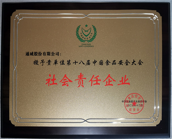 本次大會,通威股份有限公司榮膺“社會責任企業”、“2019年-2020年食品安全誠信單位”殊榮,通威股份有限公司食品事業部副總經理陳波榮獲“優秀管理者”榮譽稱號。此次榮膺三項殊榮,對通威股份弘揚企業嚴抓食品安全管理,傳遞作為大企業的社會責任感與品牌理念具有重要意義。