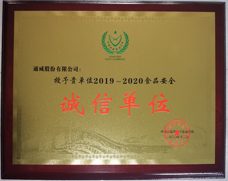 通威股份獲得“2019年-2020年食品安全誠信單位”榮譽