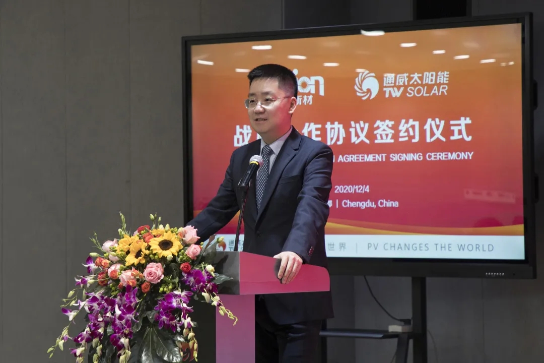12月4日,通威太陽能與常州聚和新材料股份有限公司戰略合作協議簽約儀式順利舉行。通威股份董事長謝毅,常州聚和新材料股份有限公司董事長劉海東、首席技術官岡本珍范、副總裁樊昕煒、應用技術總監朱立波,通威太陽能采購總監敖志國出席并見證簽約儀式。