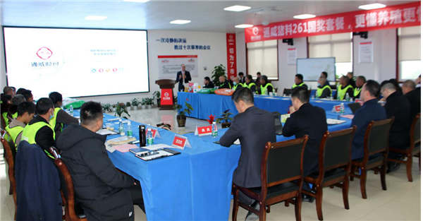 四川通威總經理彭金鋼對前來參會的客戶朋友表示熱烈歡迎。呼吁客戶朋友切實核算一下通威產品的性價比,并向客戶介紹通威豬料的特點:首先,通威的“飯碗理論”和“闖紅燈理論”,要求在原料的選擇和使用以及生產工藝方面的嚴格控制;其次,通威不養豬,專注做好產品;再次,通威是禁抗是行業的先行者和踐行者。彭總再次強調非瘟防控,并為大家介紹四川通威的生物安全防控的整個過程及措施。呼吁大家抓住養殖行情,做好養殖規劃,并邀請在座的各位客戶朋友與通威同行,共謀發展,攜手共進,智勝未來!