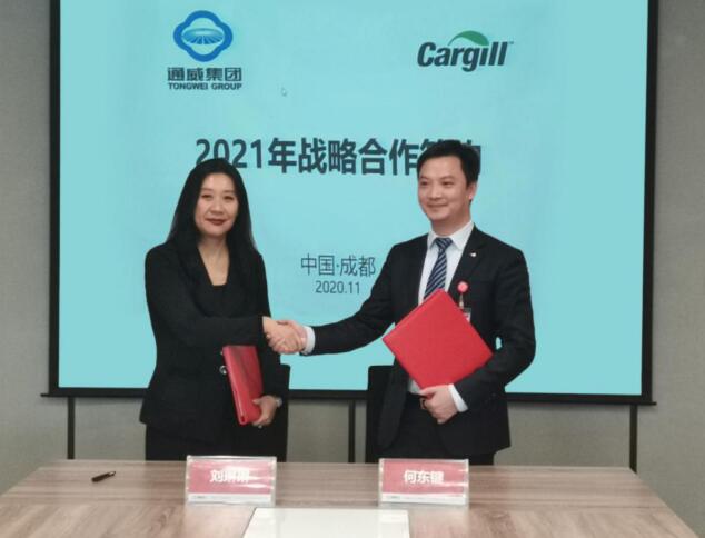 雙方在達(dá)成共識的基礎(chǔ)上,通威股份原料部長何東鍵與嘉吉北亞區(qū)商務(wù)董事總經(jīng)理劉琳琳總代表雙方公司簽署2021年25萬噸的戰(zhàn)略合作框架協(xié)議。