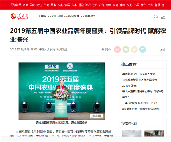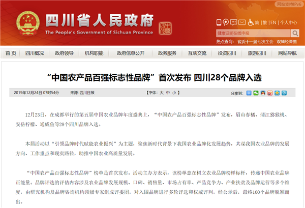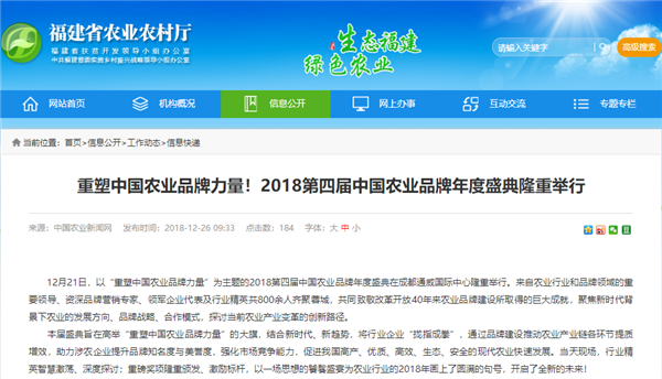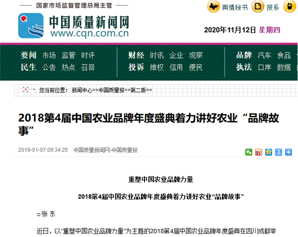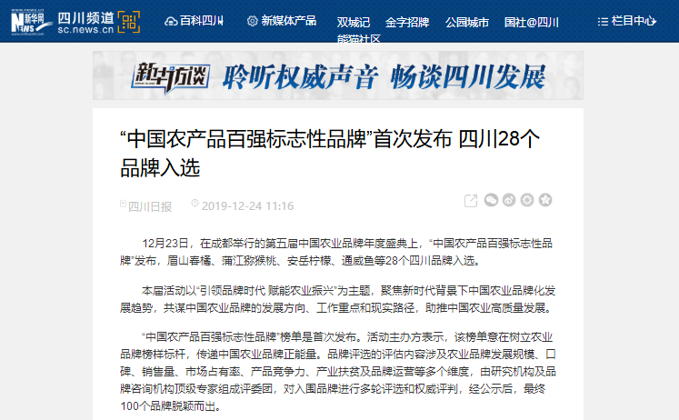 人民網、中國新聞網等主流媒體關注盛典籌備情況 近年來,中國農業品牌年度頒獎盛典緊緊圍繞新時期農業品牌建設新要求,搭建農業品牌交流平臺,展開智慧碰撞,探索農業品牌發展新趨勢、新路徑,始終保持“流量”不減。每屆盛典的成功舉行都引發央媒、各地方主流媒體及行業媒體的高度關注,話題熱度居高不下。 新華網報道截圖 2019年12月24日,新華網以《“中國農產品百強標志性品牌”首次發布 四川28個品牌入選》為題聚焦農產品百強標志性品牌發布。報道指出,本屆活動聚焦新時代背景下中國農業品牌化發展趨勢,共謀中國農業品牌的發展方向、工作重點和現實路徑,助推中國農業高質量發展。 人民網報道截圖 2019年12月24日,人民網以《2019第五屆中國農業品牌年度盛典:引領品牌時代 賦能農業振興》為題對盛典進行了報道。報道指出,盛典充分展示農業品牌建設成果、分享農業品牌建設歷程、總結農業品牌建設經驗,全面聚合我國農業品牌力量,共建我國農業品牌化時代,共商農業品牌助力脫貧攻堅之路。 中國質量報報道截圖 2019年1月7日,中國質量報以《重塑中國農業品牌力量——2018第4屆中國農業品牌年度盛典著力講好農業“品牌故事”》為題,聚焦農業品牌建設。報道指出,要從戰略層面構思,國家、地方、企業和個體的合力才能講好農業品牌故事。 盛典期間,央視《聚焦三農》欄目采訪通威集團董事局劉漢元主席 四川電視臺連續多年現場報道盛典 五年里,“中國農產品百強標志性品牌”、大咖論道、企業精英共謀新發展、品牌展示等活動愈發精彩,每屆盛典已成為發掘農業品牌新聞的“富礦”,引來眾多權威媒體、行業媒體和主流財經媒體的高度關注,發布新聞報道200余篇,品牌曝光量達上億次。其中,“中國農產品百強標志性品牌”入圍企業及評選,尤其得到了全社會的廣泛關注。 政府門戶網站轉載盛典報道 今年12月,第六屆中國農業品牌年度頒獎盛典將在成都通威國際中心隆重舉行。屆時,盛典將再次綻放新聞魅力,吸引眾多主流權威媒體、行業媒體等探會,組委會還將整合平臺資源提供傳播支持,實現千萬級覆蓋,傳遞中國農業品牌“最強音”,發現中國農業新力量。 報名咨詢: 馮女士 13608205952/028-86168147 商務咨詢: 康先生 18628275781/028-86168189 史女士 15828661332/028-86168613 陳先生 18782983897/028-86168393 趕快掃描下方二維碼,報名參會吧!