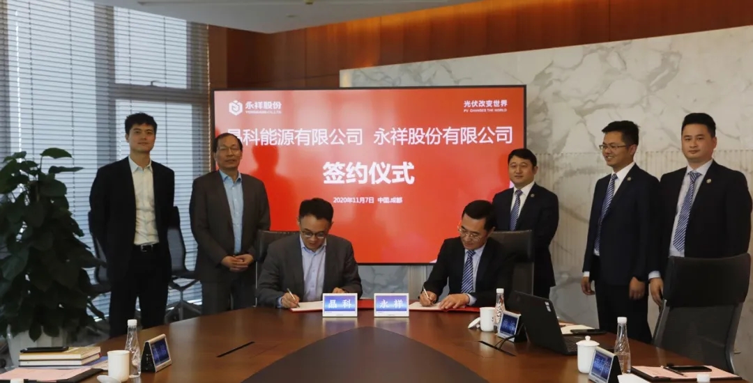 11月7日,永祥股份與晶科能源簽訂大額銷售框架合同。通威股份董事、永祥股份董事長兼總經理段雍,晶科能源有限公司首席運營官徐志群、常務副總經理陳銘、采購總監蔣鵬,永祥股份副總經理禚東舉等出席簽約儀式。