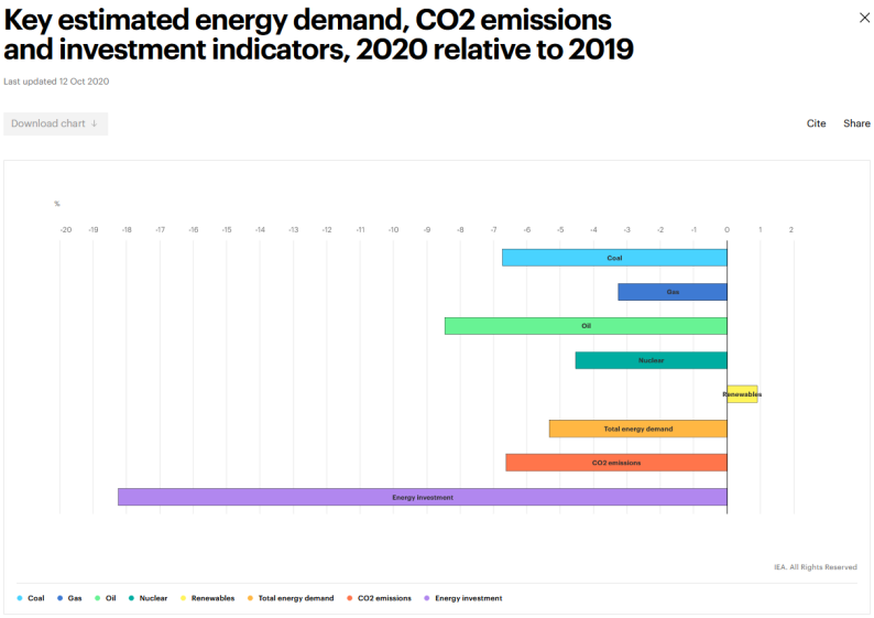 新冠疫情對全球能源造成的破壞超過了近年來任何其他事件,這些影響將在未來數年持續。國際能源署評估發現,2020年全球能源需求將下降5%,與能源相關的二氧化碳排放將下降7%,能源投資將下降18%。影響因燃料而異。預計石油需求將下降8%,煤炭使用量將下降7%,這與可再生能源貢獻的小幅上升形成了鮮明對比。天然氣需求的降幅約為3%,而今年全球電力需求的降幅似乎將相對較小,為2%。