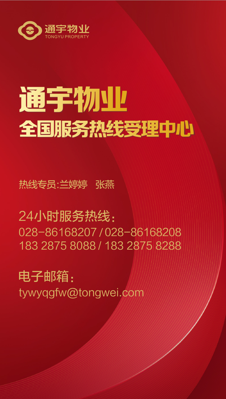 通宇物業以成都為中心,輻射雙流、樂山、眉山、西昌、合肥、包頭、保山等地,管理項目涵蓋寫字樓、住宅、商業綜合體、工業園區等。為滿足業主快速解決問題的需求、踐行公司標準化建設,公司全國物業服務熱線統一升級、專項投訴郵箱組開通受理,通過優化和完善服務流程的每個細節,提升對客服務的效率和水平,為業主提供24小時晝夜循環保障服務,成為公司對外服務交流的重要渠道。