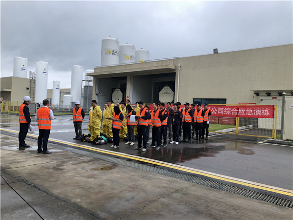 此次演練主要模擬公司特氣站氨氣供應間發生氨氣泄漏事故。9月25日上午10點25分,特氣站中控室氣體偵測報警系統發出氨氣報警,特氣站負責人查看現場后立即報告部門領導,通知公司ERC人員,由于現場難以控制,公司ERC成員立即報告總指揮,并啟動二級氨氣泄漏專項應急預案。安全環境部負責人擔任總指揮,廠務部負責人擔任現場指揮,搶險救災組、醫療救護組、后勤安保組迅速到位,立即展開救援。搶先組控制、關閉液氨槽車閥門泄漏源并匯報現場情況。演練現場各應急小組各司其職,現場很快得到控制并消除,達到了演練的預期效果。