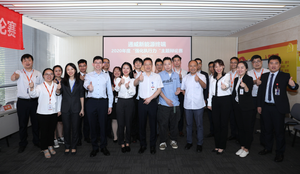 本次辯論賽共分兩場,辯題分別為“提高企業執行力,關鍵在于領導還是員工”和“創建一流企業,創造力與執行力哪個更重要”。16位辯手們展開了激烈交鋒和唇槍舌戰,或旁征博引,或引經據典,或以辯明理,或以論正道,展現了終端辯手們的靈活反應和臨場應變。經過兩場思維的碰撞和智慧的交鋒,來自漁光物聯的武夢婷獲得“最佳辯手”稱號。 合影留念 2020年,通威新能源深入貫徹通威集團董事局劉漢元主席“聚勢聚焦、執行到位、高效經營”的重要指示,緊跟集團企業文化建設步伐,將文化建設與倡導執行力有機結合,相互促進,多措并舉打造精兵強將,助推企業執行力文化深入人心。在成功舉辦“強化執行力”辯論賽的同時,新能源終端還有序推進征文、攝影比賽及其他極具終端特色的企業文化活動,深化企業文化內涵外延,多角度、多形式、全方位促進企業文化建設,助力“內化于心,外化于行”的通威文化打造,讓執行力文化在終端得到全面貫徹,持續提升全員各方面能力和水平,助推通威事業再創新輝煌!