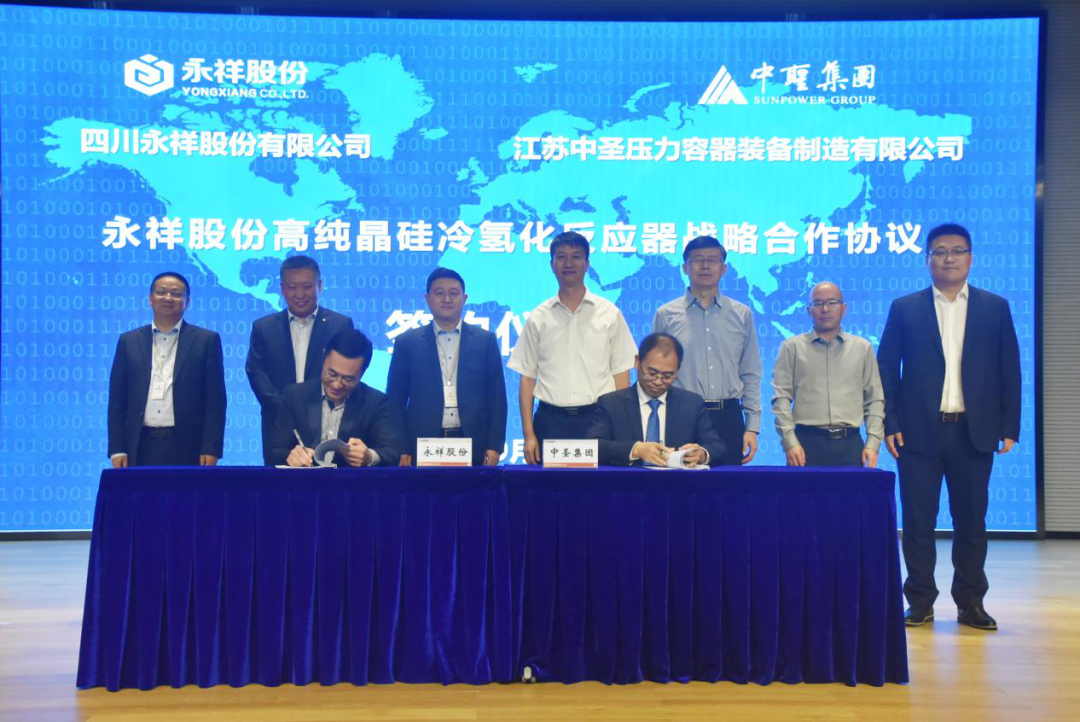 9月21日,永祥股份與中圣集團成功簽訂戰略合作協議。中圣集團副董事長、執行董事馬明及高管團隊,通威股份董事、永祥股份董事長兼總經理段雍,永祥股份董事兼首席技術官甘居富、永祥股份副總經理兼永祥新能源總經理李斌、永祥股份副總經理禚東舉出席。