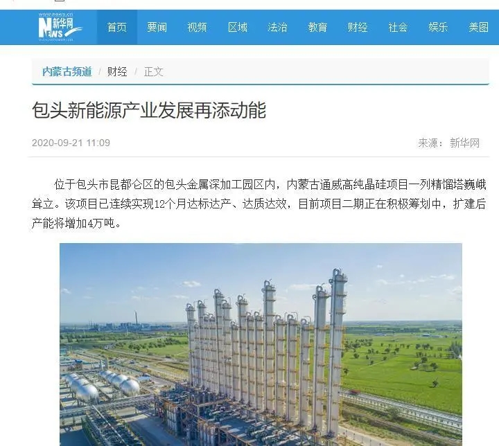 9月21日,新華網以《包頭新能源產業發展再添動能》為題聚焦內蒙古通威高純晶硅在包頭的發展情況。報道中指出,位于包頭市昆都侖區的包頭金屬深加工園區內,內蒙古通威高純晶硅項目一列精餾塔巍峨聳立。該項目已連續實現12個月達標達產、達質達效,目前項目二期正在積極籌劃中,擴建后產能將增加4萬噸。