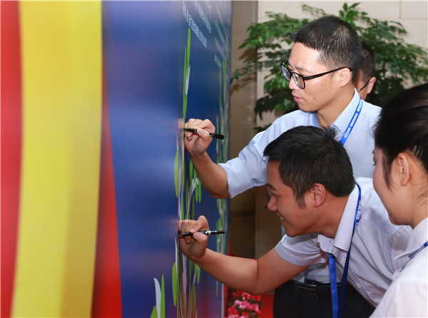 為獻禮通威38年華誕,9月18日,由集團品牌管理中心策劃的“基業長青 砥礪前行”通威幸福樹活動在通威國際中心一樓大廳成功舉行,受通威集團董事局劉漢元主席委托,通威集團禚玉嬌總裁、副總裁管亞偉、胡榮柱、黃其剛,通威股份副董事長嚴虎、總裁郭異忠等集團和股份領導出席活動,共同祝福通威38歲生日快樂,祝愿通威明天更美好。
