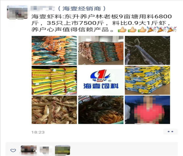 簡單的服務動作使得楊雙全7月動保銷量同比增長102%,但比動保銷量增長更令人開心的是來自客戶對他以及對公司產品的認可。楊雙全靠著自己精細的服務以及公司高質的產品使得自己服務的老板出蝦時9畝塘,平均每斤35只,共上市7500斤,餌料系數僅0.9。這個消息一出連銷售海壹料的經銷商都高興得忍不住發了一個朋友圈來祝賀,并表示了對海壹料的認可。