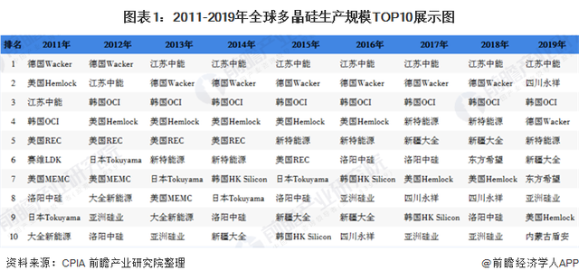 2011年至2019年,德國 Wacker 和保利協鑫子公司江蘇中能你追我趕,爭奪多晶硅產業首席地位。2019年全球多晶硅料產能前十排名中,中國占據7個席位,其中保利協鑫全球市場份額第一。從趨勢看出,行業集中度向龍頭聚攏。此外,像是韓華、美國REC等海外企業的退出或是減產必將加速硅料的國產化替代。