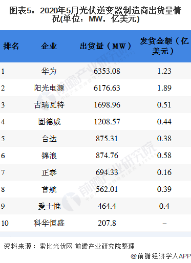 在逆變器方面,從2020年1-5月的海外市場整體發貨情況來看,華為以6353.08MW的出口量排名第一;其次為陽光電源,其國內出口量4266.63MW,印度工廠發貨量1910MW,總計6176.63MW;再者是古瑞瓦特,其出口量為1698.96MW。