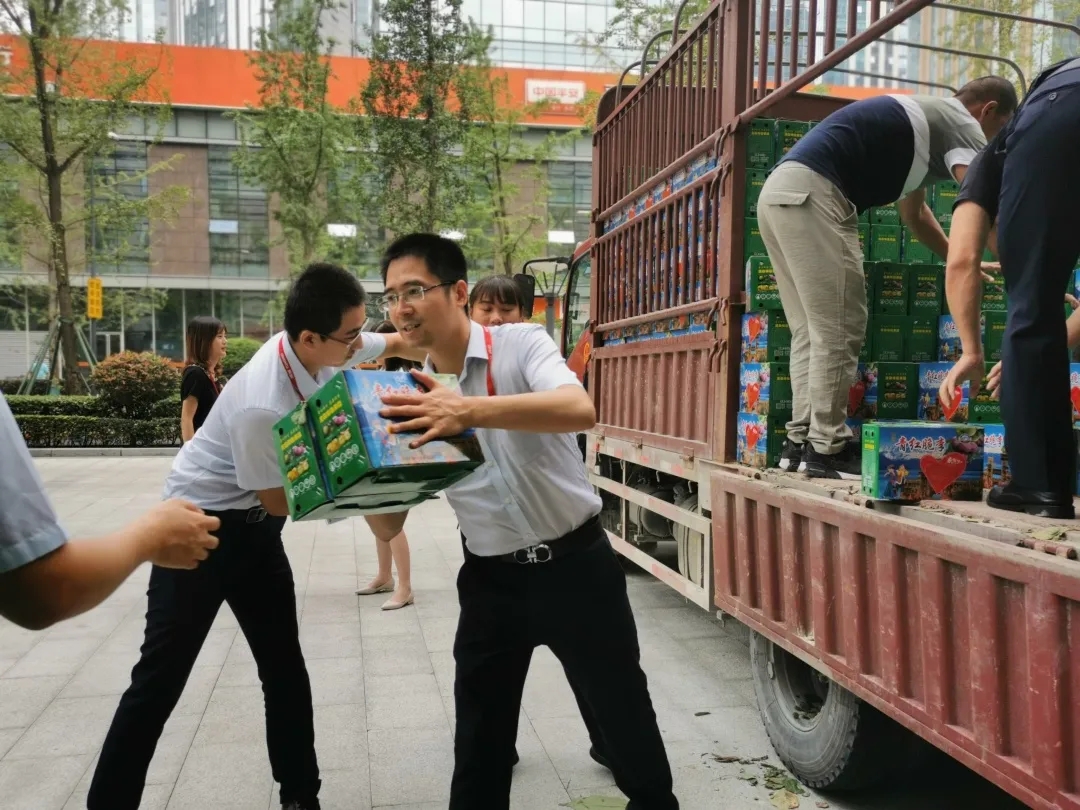 合影留念 大災無情,通威有愛。茂縣嶺崗村平均海拔1300米,是傳統的農業村,全村以種植脆紅李為主,本應是果實成熟,全村農戶豐收的季節,但卻因強降雨引發洪水導致多處山體滑坡,道路中斷,果子斷了銷路。在得知這一消息后,集團工會立即對接,購買近500箱脆紅李作為福利分發給公司每位員工,并積極通過工會渠道向其他企業單位宣傳推廣,向社會傳遞這份愛心。 通威員工的愛心傳遞 李書記親自隨車將脆紅李運送到通威,并表示,李子都是村民們現摘裝箱,連夜從村里送過來的。感謝通威集團工會在艱難時刻及時伸出援助之手,參與消費扶貧,幫助大家渡過難關,同時也相信因為來自通威的愛,因為鄉親們的汗水,每個通威人手里的李子都格外甜!