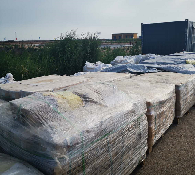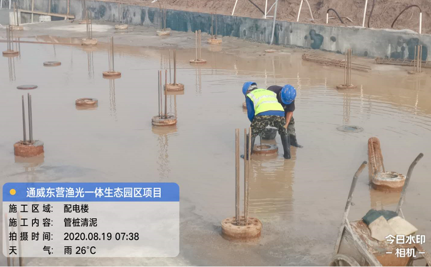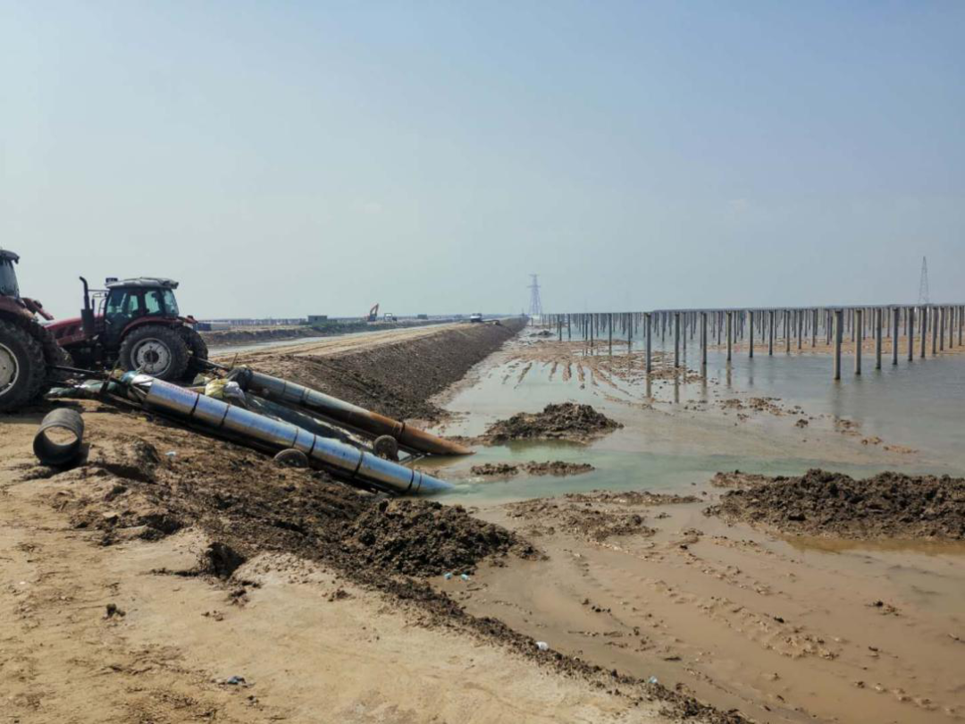 東營項目占地4200畝,土地均為鹽堿地,連續(xù)的大雨讓場內(nèi)地面遇水成淤泥,泥濘道路導致車輛無法在場內(nèi)通行,原本的干塘作業(yè)也變成水塘施工,嚴重加大了東營項目的施工難度。針對汛期道路泥濘、項目工期緊迫、施工進度緩慢和施工難度較大等不利因素,項目部積極協(xié)調(diào)各方關系,迅速組織力量,按照防汛工作“思想、組織、措施、物資”四落實和“人員、措施、工作”三到位要求,在確保工程安全的前提下,加班加點、不舍晝夜的搶施工進度,并在場內(nèi)備足大揚程水泵,減少塘內(nèi)積水帶來的施工難度。除此以外,還為設備物資穿上防護“雨衣”,防止設備受潮,切實保證項目施工的進度、質(zhì)量和安全。