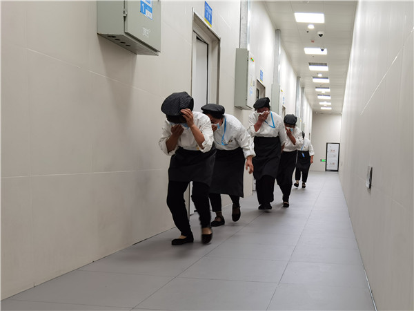 演練模擬食堂熱灶間由于線路故障突發(fā)火災(zāi)事故,煙霧迅速蔓延,食堂工作人員發(fā)現(xiàn)火情立即關(guān)閉風(fēng)機(jī)、切斷電源使用滅火器進(jìn)行了初期滅火,并匯報(bào)食堂管理人員。隨后,食堂管理人員迅速組織工作人員就近使用水浸濕毛巾,捂住口鼻,井然有序的疏散至安全地帶,同時(shí)對(duì)火災(zāi)現(xiàn)場(chǎng)進(jìn)行滅火、警戒。最終,火災(zāi)被撲滅,無(wú)人員傷亡,演練圓滿結(jié)束。