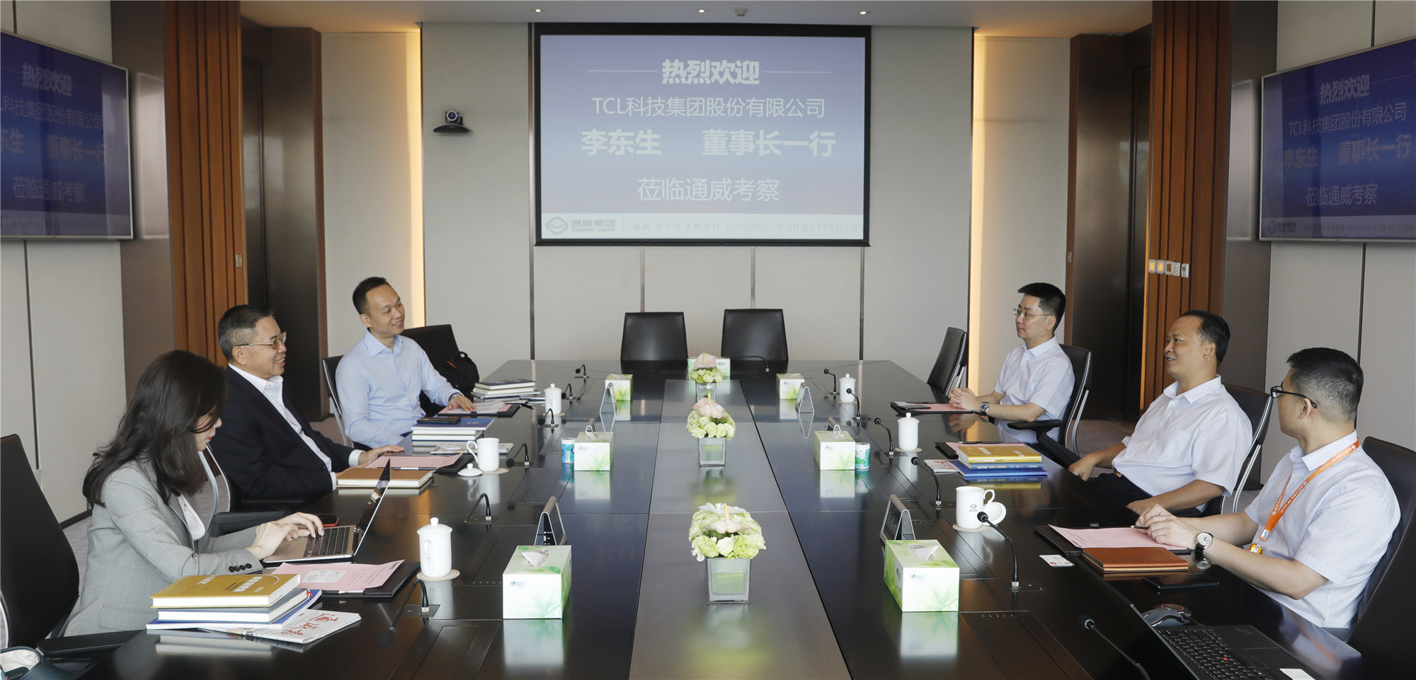 8月24日,TCL科技集團(tuán)股份有限公司董事長李東生,集團(tuán)副總裁、董事會(huì)秘書廖騫一行蒞臨通威考察。十一屆全國政協(xié)常委、全國人大代表、通威集團(tuán)董事局劉漢元主席熱情接待,通威股份董事長謝毅陪同接待。