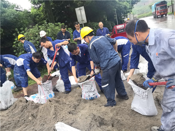 在各個部門負責人的安排下,急速召集各區(qū)域人力投入“戰(zhàn)斗”,在緊急情況下大家不慌不亂,明確分工,從買口袋、裝沙袋,到碼放沙袋、堵水,每一步都清晰明確,正當大家齊心協(xié)力鏟沙、扛沙包的時候,天公不作美,嘩嘩嘩的水把我們裝沙包的沙土浸透,給我們的裝填工作增加了難度。可是管理干部、員工越挫越勇,伴著員工們“吱啦、吱啦”鏟著沙子,裝袋一刻也不停歇。所有扛著沙袋的人臉頰上都滴著水珠,這時我們早已分不清是汗水還是雨水,忙碌的奔波在這一條本來就不夠?qū)挸ǖ牡缆飞稀=?jīng)過一個多小時的忙碌,眼看就要將罐道填滿了,突然發(fā)現(xiàn)因罐子底部太深不能將沙袋均勻鋪滿。這時,一位瘦小的員工二話不說戴上安全帽在安全員的陪同下進入灌道開始了作業(yè),10分鐘后,成功將未均勻鋪滿的沙袋全部處理完成。經(jīng)過兩個小時的奮戰(zhàn),在大家的共同努力下, 終于將入河總排口處堵住。