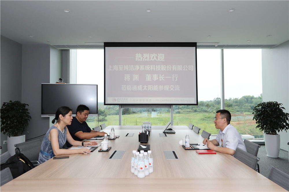 8月12日,上海至純潔凈系統科技股份有限公司董事長蔣淵一行蒞臨通威太陽能成都公司參觀交流。通威太陽能副總經理周華熱情接待并座談。