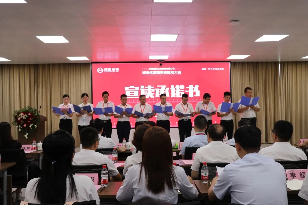 會上,蔡總回顧了南昌生物發展歷程,并表示,公司高度重視并積極響應標準化管理項目工作,進一步打造成行業標桿,并將持續為通威股份農牧板塊跨越式增長貢獻力量。南昌生物總經理助理蔣志軍宣讀南昌生物公司標準化管理項目組組織架構和任命書,蔡總帶領各部門經理宣讀承諾書。