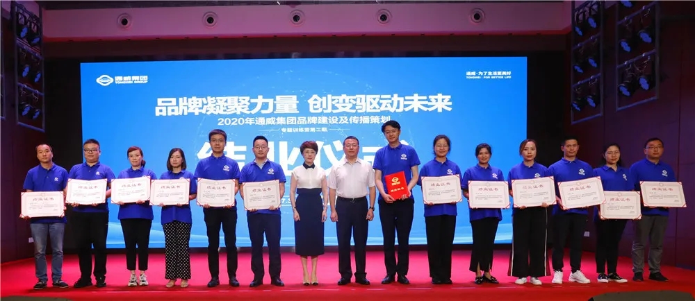 為全力滿足集團發展需要,營造良好的內外輿論環境,進一步夯實并強化通威品牌核心競爭力,7月30日—31日,在通威集團企業文化專項領導小組副組長、集團禚玉嬌總裁的高度重視和親自指揮下,由通威集團企業文化專項領導小組主辦,由集團品牌管理中心、通威集團人力資源部、通威股份人力資源部、通威傳媒聯合承辦的2020 年通威集團品牌建設及傳播策劃專題訓練營在通威國際中心成功舉行。本次活動以“品牌凝聚力量 創變驅動未來”為主題,來自管理總部及各體系,各分、子公司品牌負責人和骨干、企業文化專員及策劃專員等近百人參與培訓。集團企業文化專項領導小組副組長、集團禚玉嬌總裁,集團企業文化專項工作小組執行組長、集團副總裁黃其剛出席結業儀式并為學員頒發結業證書。