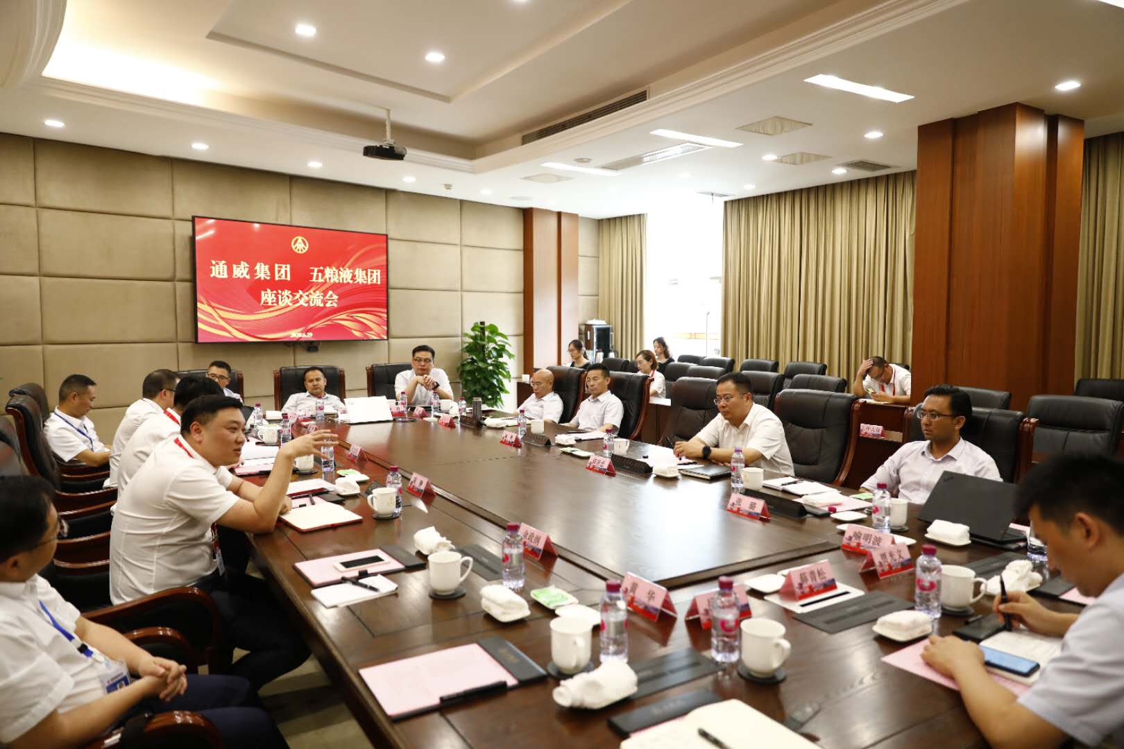 6月29日,十一屆全國政協常委、全國人大代表、通威集團董事局劉漢元主席率通威股份管理團隊赴五糧液集團交流學習,通威股份董事長謝毅、總裁郭異忠、公司高管及管理總部各部門負責人等全程參與。五糧液集團公司黨委書記、董事長李曙光熱情接待。