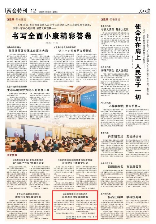 5月26日出版的《人民日報》在兩會特刊“發言席”板塊刊登劉漢元主席《以發展光伏促能源轉型》的發言。劉主席在發言中表示,光伏發電全過程零污染、零排放,有著足夠的成本優勢。當前,光伏作為可再生能源的重要組成部分,贏得了廣泛的關注。為應對全球氣候變化,目前各國都在研究制定可再生能源發展目標。建議通過制定更具前瞻性的可再生能源發展目標,加大對以光伏為代表的可再生能源支持,減免可再生能源稅費,引導可再生能源產業健康發展。適度提高非化石能源占一次能源消費比重,促進我國能源轉型,加快清潔能源發展進程。
