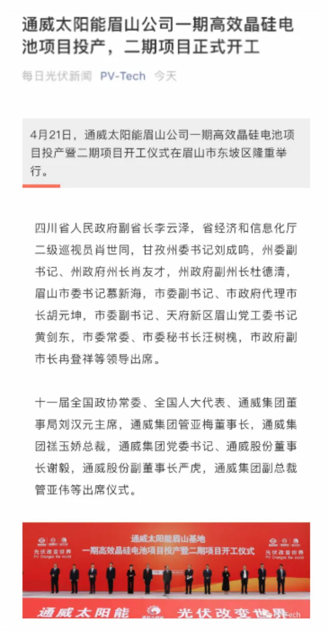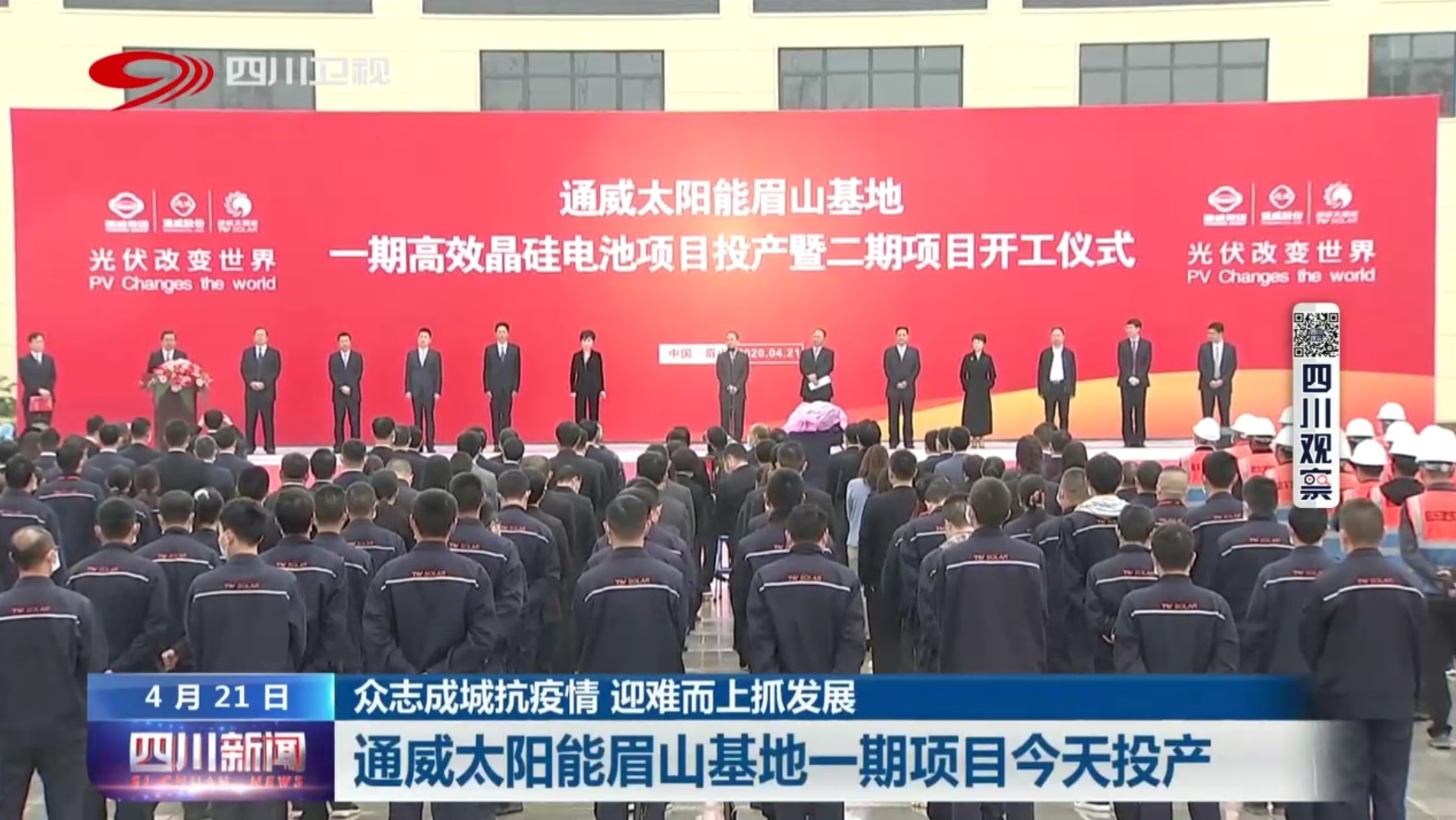4月21日,通威太陽能眉山公司一期高效晶硅電池項目投產暨二期項目開工儀式隆重舉行。投產暨開工儀式,受到中央廣電總臺國際在線、人民網、中國新聞社、四川電視臺、川報觀察、《眉山日報》、眉山電視臺、黑鷹光伏、索比光伏網、PV-Tech、SOLARZOOM、能源一號等80余家央級權威媒體、省市主流媒體、行業媒體連續兩天強勢聚焦,通過文字、圖片、新媒體等豐富形式,展現儀式盛況,點贊“通威速度”。
