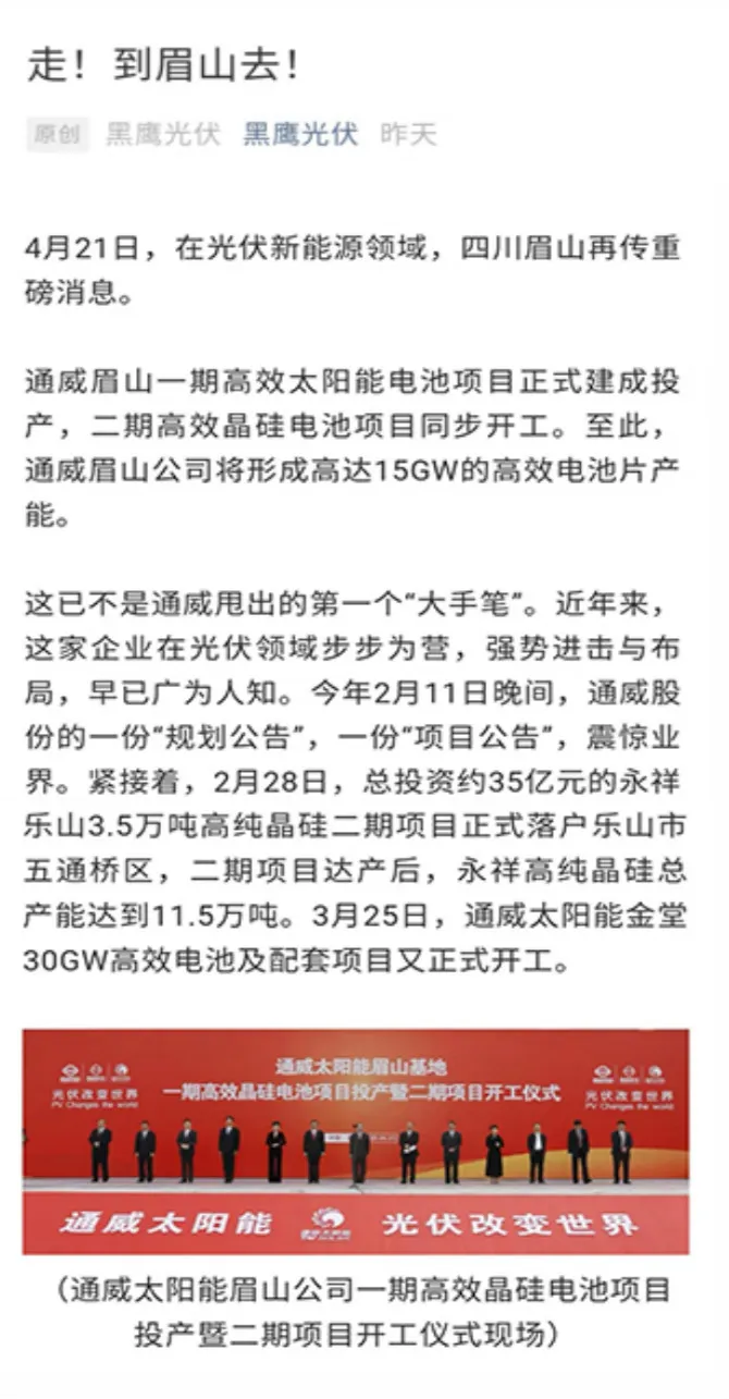 黑鷹光伏以“走!到眉山去!”為題解讀“通威速度”和“通威底氣”。報道指出,在助力治蜀興川同時,眉山項目的建成投產,也將為通威在全球新能源最新競局中落下重筆。通威投資超百億的“眉山坐標”,無疑成為通威新能源大棋局中不可或缺的重要一環。