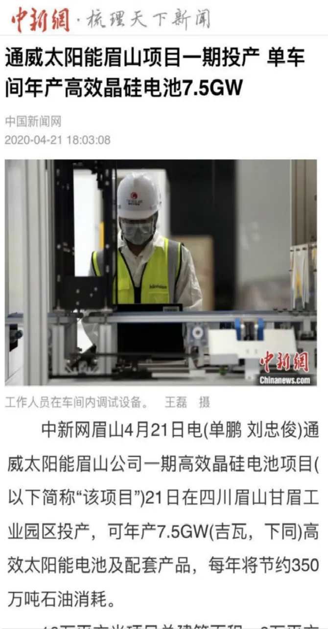 4月21日,作為央級權威媒體,中央廣電總臺國際在線、人民網、中新社紛紛推出報道,聚焦通威當天儀式。中央廣電總臺國際在線報道指出,通威太陽能眉山基地一期高效晶硅電池項目共有16條生產線,以高效電池無人智能制造路線為主,建設有智能化工廠、數字化車間、物流倉儲及相關配套設施,可年產7.5GW高效太陽能電池及配套產品。