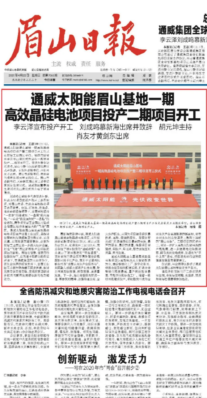 4月22日,《眉山日報》于頭版頭條位置深度解讀開工儀式現場情況及項目情況,并指出,通威太陽能眉山基地高效晶硅電池項目以高效電池無人智能制造為主,建設智能化工廠、數字化車間、物流倉儲及相關配套設施,打造全球智能化程度最高、量產轉換效率最高、節能環保的綠色工廠。