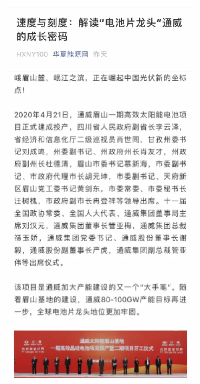 華夏能源網在題為“速度與刻度:解讀‘電池片龍頭’通威的成長密碼”的報道中指出,隨時“擼起袖子加油干”的通威,已發展成為中國光伏的標桿。從合肥,到成都,再到眉山,每一個基地都是一座里程碑,展示的是通威不一樣的企業基因。通威,正在書寫中國太陽能產業的新故事、新傳奇。