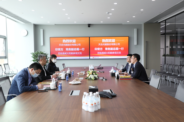 4月17日,天合光能股份有限公司常務副總裁印榮方一行蒞臨通威太陽能參觀交流。通威股份董事長謝毅熱情接待,通威太陽能生產、營銷、采購相關負責人參與接待。
