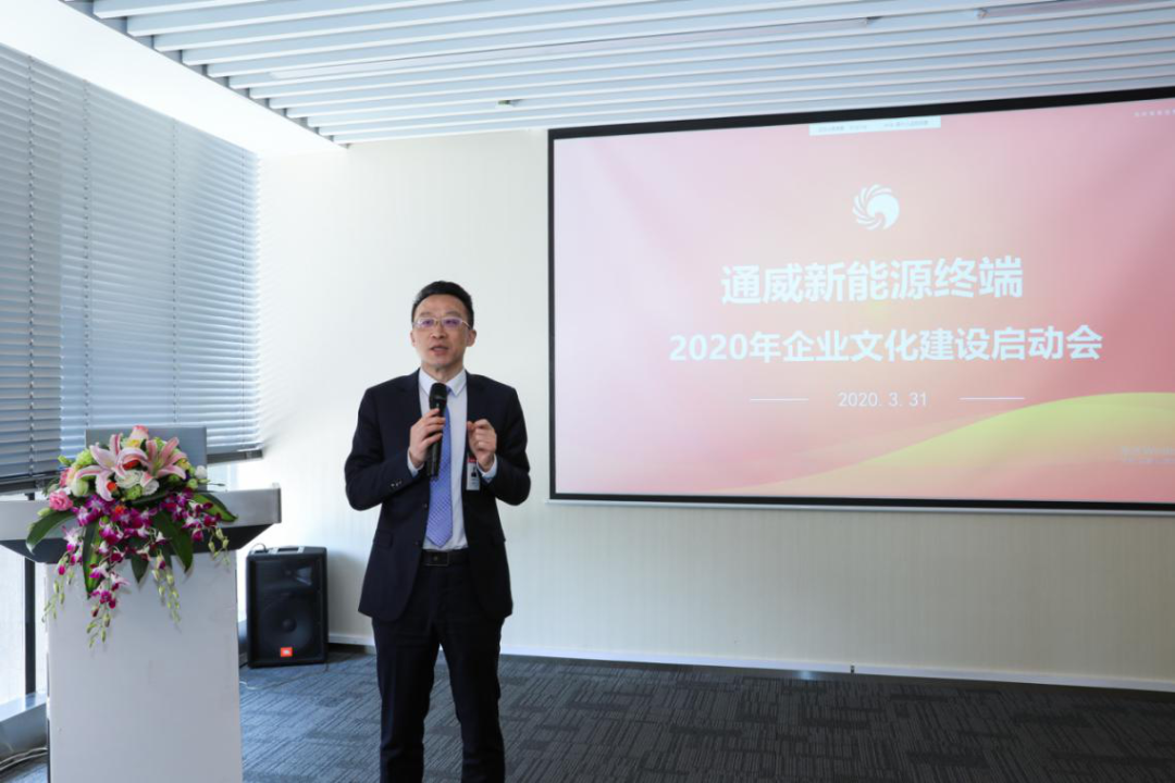啟動儀式現場 啟動會上,全員學習了劉漢元主席在集團2020年度企業文化啟動儀式上的講話。通威新能源企業文化專項工作組公布了本年度企業文化活動主線,圍繞“對標、精益、執行”的主題,設置了強化執行力系列管理活動、“創建學習團隊,打造強勢之師”學習培養系列活動、情暖新能源系列文化活動等5個主題活動,同時將開展“強化執行力”主題辯論賽、“我眼中的執行力”主題征文大賽、“聚焦執行力”主題攝影大賽及執行力十佳標桿公司評選等多個主題評選比賽。 通威股份光伏事業部總裁陳星宇作總結發言 陳總就通威新能源年度企業文化工作作出指示,并表示,通威新能源成員來自五湖四海,在文化的滲透上需要引導、理解和交流。通威自1982年發展至今,擁有38年的發展歷程,兩大主業及適度多元化的業務形態造就了不同的業務領域,文化則是各板塊統一相連的紐帶、平臺。通威新能源作為光伏應用端,要思考如何做好企業文化落地,并結合自身特點去落實和踐行。今年劉主席再提執行力,重提執行力,值得終端在坐的每一員深刻思考。執行力是終端邁入新階段的自我審視,也是對立足新起點的再次考量,終端每個項目的成功都來之不易,要持之以恒提升執行力,從開發、設計、建設、運營到運維,每天進步1%,對標行業標桿,力爭成為行業排頭兵。 陳總表示,年初受環境影響,國外光伏產品需求變淡導致國內產品價格下滑,結合市場環境,通威新能源應當苦練內功,在環境中尋找機遇,持續以“賽馬文化”打造終端執行力、核心競爭力。各公司及員工要以實際行動踐行企業文化,讓文化伴隨公司成長、發展,以對文化深刻的認知和理解,推動業務向前,解決需要解決的問題,緊抓務實工作,以文化拉動執行,相信未來通威新能源在光伏終端的發展越來越好! 會議期間,各公司企業文化代表均進行主題發言,闡述對企業文化的理解,并紛紛表示將努力學習“對標、精益、執行”的企業文化精神,將文化滲透到工作執行中,助推業務發展。