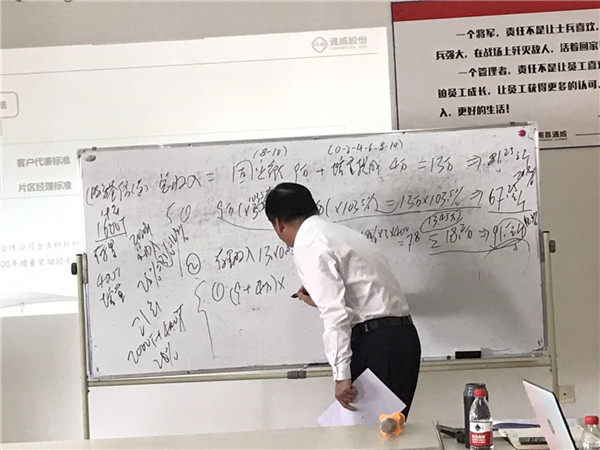 沈總結合合肥通威案例,根據賈部長講解,為大家進行測算演示薪酬核算方案,并指出:“理清楚,并執行到位”,今天我們理清楚,今年我們執行到位,為華中一區再創更高的輝煌一起努力。