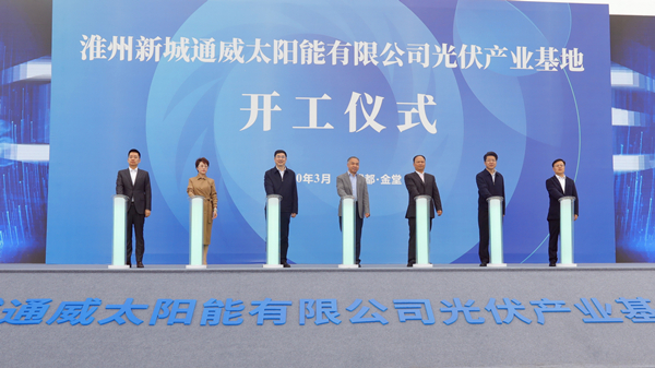 3月25日,通威太陽能光伏產業基地項目開工儀式在成都淮州新城隆重舉行。四川省委常委、成都市委書記范銳平,市委副書記朱志宏,副市長曹俊杰,金堂縣委書記、淮州新城黨工委書記辜學斌,縣委副書記、縣長古建橋等領導出席。十一屆全國政協常委、全國人大代表、通威集團董事局劉漢元主席,通威集團禚玉嬌總裁,通威集團黨委書記、通威股份董事長謝毅,通威股份副董事長嚴虎、總裁郭異忠等出席開工儀式。