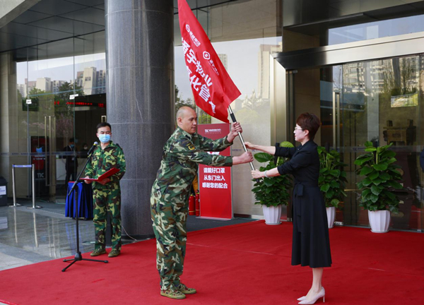 通威國際中心秩序部副經理伍勇剛接受禚玉嬌總裁授旗