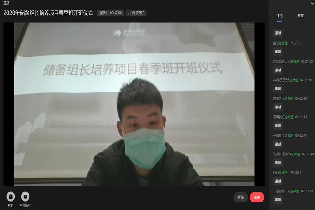 在當下全國人民同心協力共同戰“疫”的特殊形式下,為保證公司各類培訓項目有序順利開展,保障學習防控兩不誤,通威大學光伏學院于3月6日通過線上直播的方式,在成都、合肥兩地組織開展儲備組長培養項目春季班開班儀式。兩地質量部、生產部、中威電池廠各部門負責人及培養班學員、導師代表共計200余人受邀遠程參加。