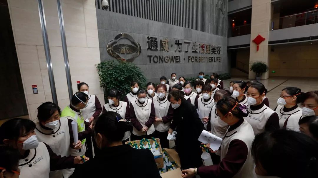 為貫徹落實主席指示,集團行政后勤體系聞風而動,立即執行。當天下午,集團副總裁黃其剛帶領集團行政后勤體系管理團隊,實地檢查了通威國際中心東廣場大門、停車場、電梯間、餐廳等關鍵場地,詳細了解體溫測量、物資儲備、內外消殺、值班人員安排等具體情況和工作細節。